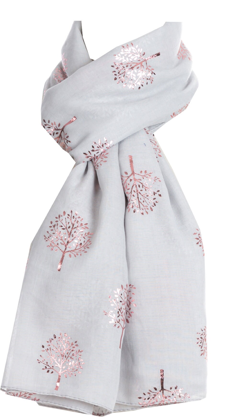 Beautiful Light Silver Scarf with Pink Foil Print Mulberry Tree. Soft and warm. Perfect for casual and formal wear. Looks great under light, indoors and outdoors. Size: 90 x 180 cm.