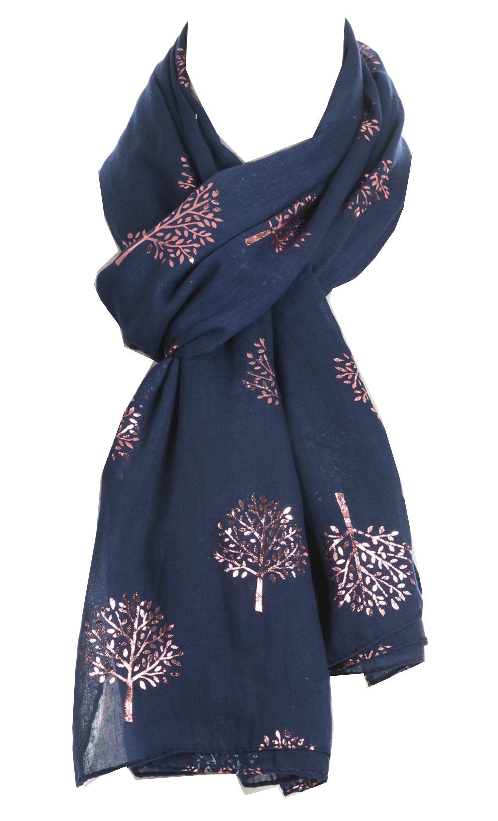 Beautiful Navy Scarf with Pink Foil Print Mulberry Tree. Soft and warm. Perfect for casual and formal wear. Looks great under light, indoors and outdoors. Size: 90 x 180 cm.