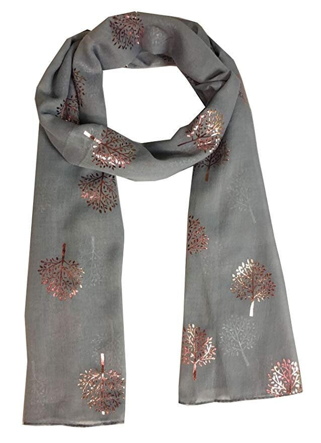 Beautiful Silver Scarf with Pink Foil Print Mulberry Tree. Soft and warm. Perfect for casual and formal wear. Looks great under light, indoors and outdoors. Size: 90 x 180 cm. Material: 100% Viscose.