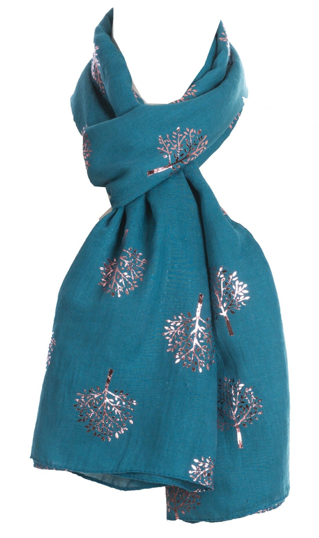 Beautiful Teal Scarf with Pink Foil Print Mulberry Tree. Soft and warm. Perfect for casual and formal wear. Looks great under light, indoors and outdoors. Size: 90 x 180 cm.