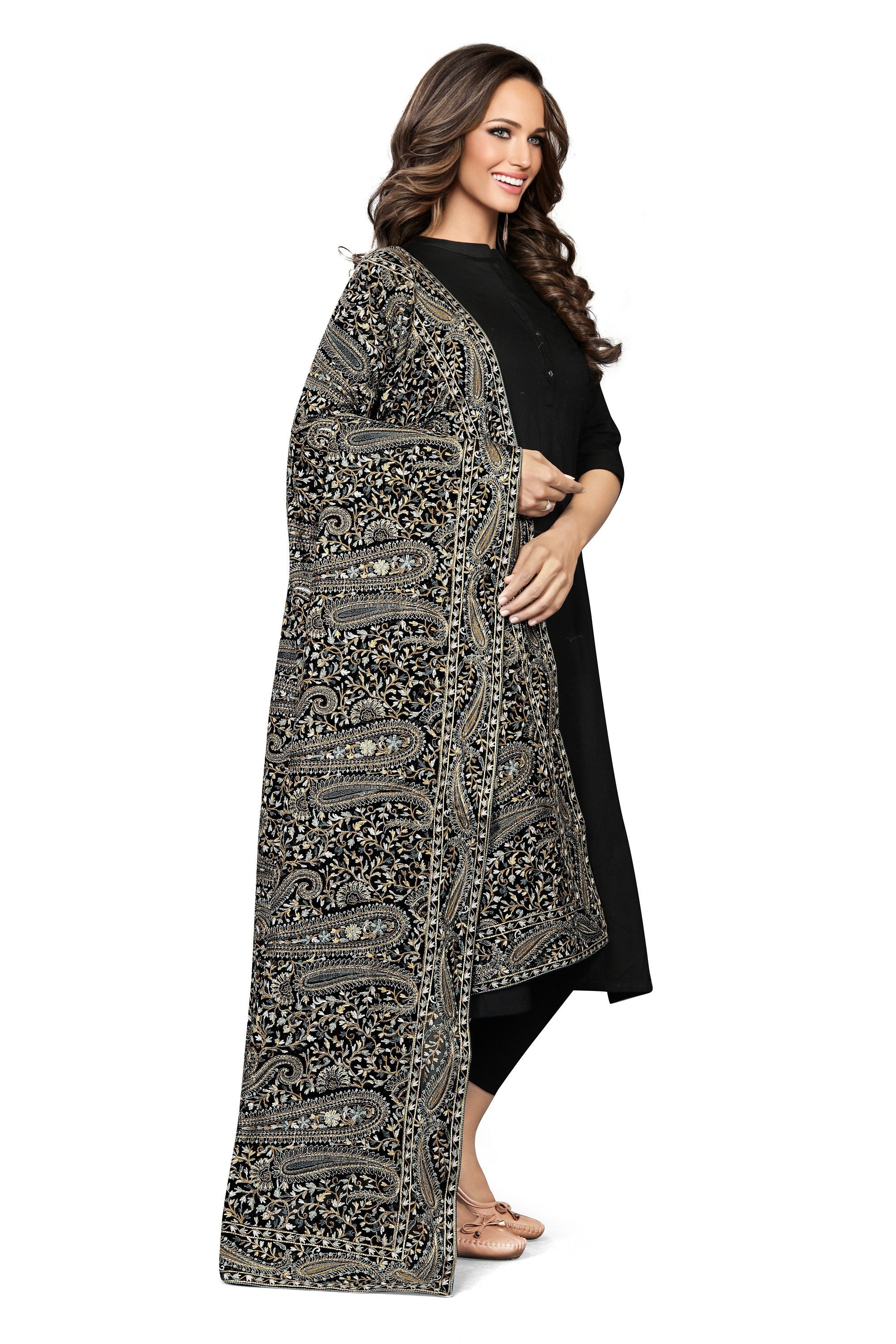 Embroidered Shawl, Scarf, Wrap with Beautiful Needlework Craftsmanship This Stunning Hand Embroidered Is a Beautiful Example of Kashmiri Master Craftsmanship The Embroidery is done with silky gold thread Dry Clean Only A Big sized ShawlGreat For Those Chilly Days/Evenings and/or Party/Occasion WearExcellent CHRISTMAS Gift!!! Makes a Fantastic Gift for Your Family Members, Friends, etc. Can be gifted on Birthdays, Anniversaries, Weddings, Engagements, Mother's Day, Valentines, Thanksgiving, Friendship Day, Corporate Gifts, Office Gifts, Etc. Perfect to wear on any Occasion
