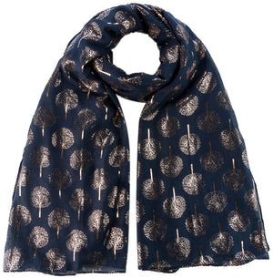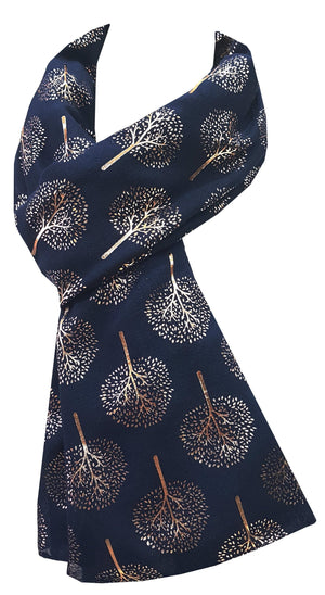 Beautiful Navy Blue Scarf with Gold Foil Print Mulberry Tree. Soft, warm and large. Perfect for casual and formal wear. Looks great under light, indoors and outdoors. Size: 90 x 180 cm. Material: 100% Viscose.