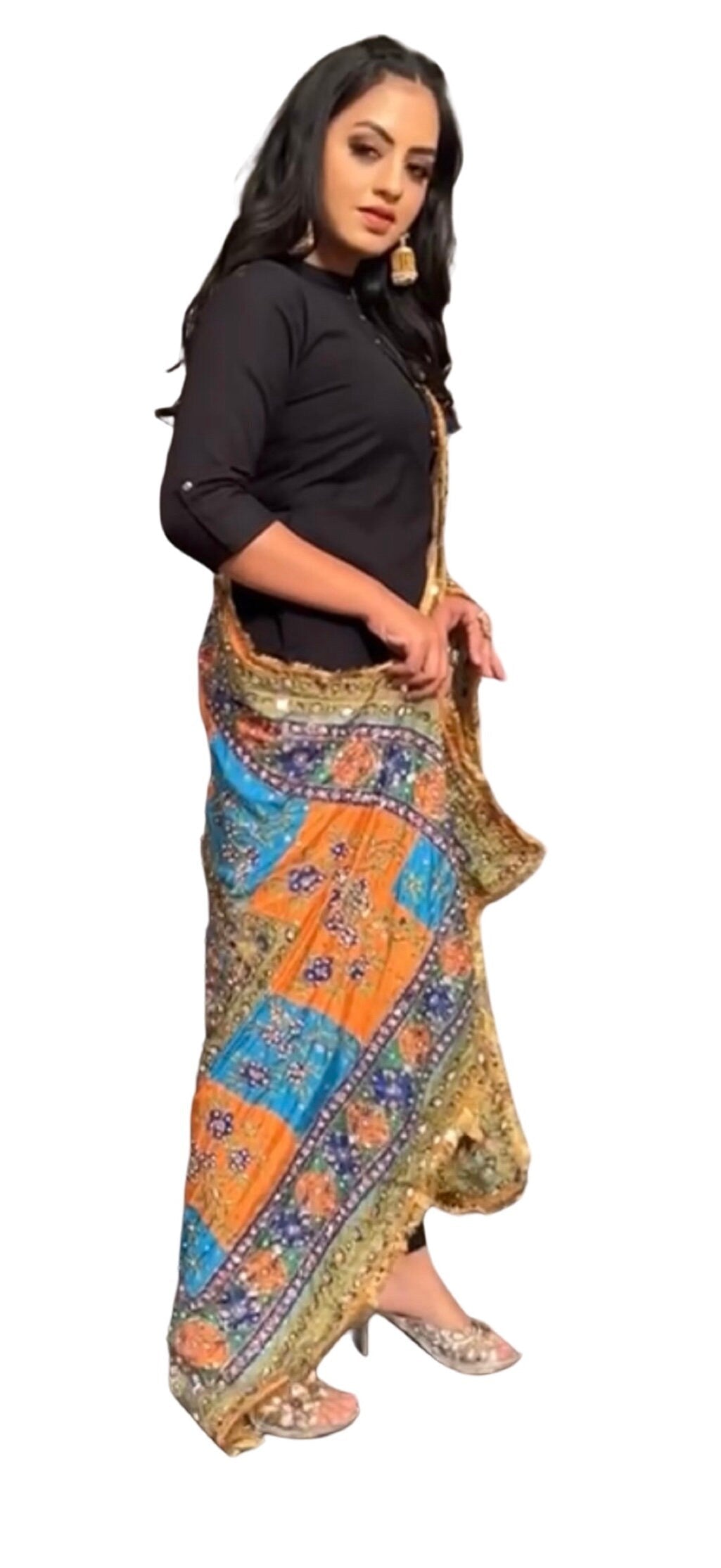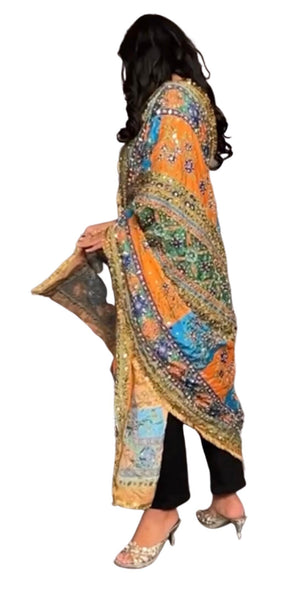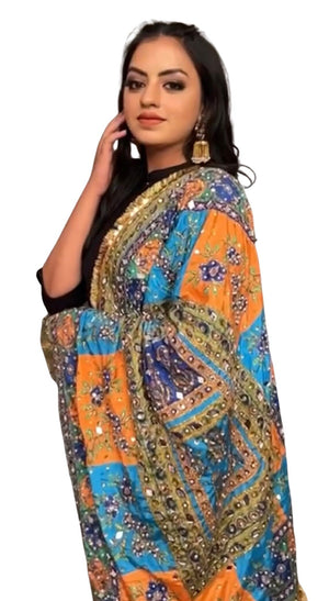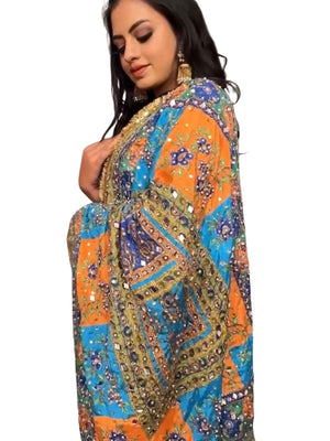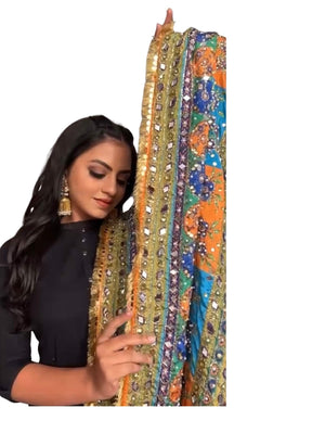 Crafted with meticulous attention to detail, this chunri showcases a symphony of vibrant colors, reflecting the essence of traditions. The intricate mirror work embellishments add a touch of enchantment, creating a mesmerizing interplay of light and beauty. Measuring generously in size, this chunri provides ample coverage, allowing you to drape it gracefully over your shoulders or elegantly wrap it around your waist. The flowing fabric drapes effortlessly, creating a stunning silhouette and capturing attention with its sheer elegance. Whether you're a bride, a bridesmaid, or a wedding guest, this Wedding Chunri is a versatile accessory that complements a range of ensembles. From traditional bridal attire to contemporary wedding outfits, its timeless appeal enhances your overall look, making you feel like the epitome of grace and style. Indulge in the allure of tradition and elevate your wedding ensemble with our magnificent chunri. Embrace the enchanting mirror work, embrace the cultural richness, and embrace the elegance that our Wedding Chunri brings to your unforgettable day.
