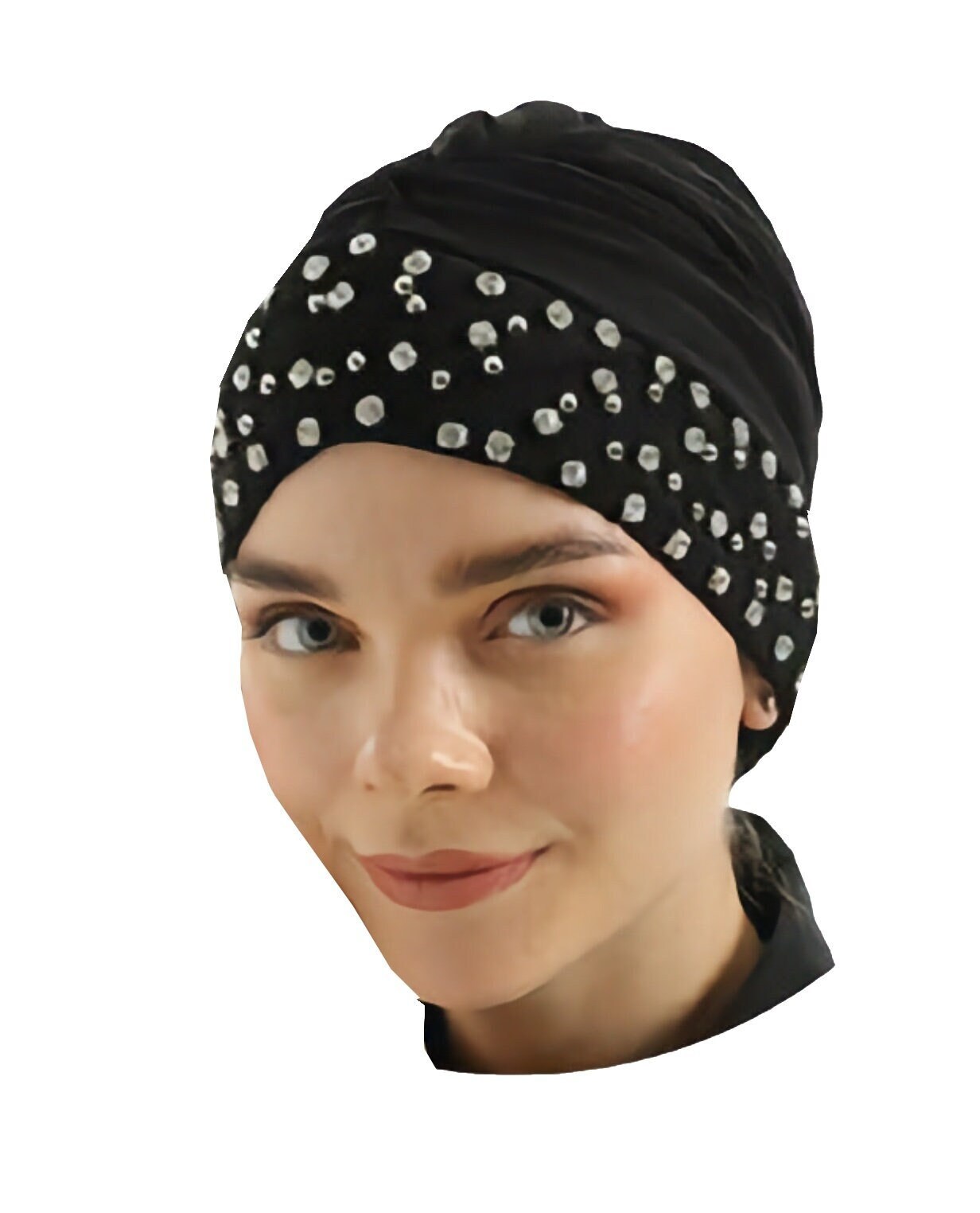 Well this Turban Cap is the perfect piece to add to your wardrobe - embellished with silver stone and silver beads across the front of the cap. This Turban/Cap sits perfectly across the front of your head /ear to ear. Great to wear Under your Scarf/Hijab to give that extra 'Va Va Voom' to your scarf styling. Perfect to wear at any event like Weddings, Eid, Parties, etc. The Turban/Cap is pleated from the front if you just want to wear it on its own.This will keep your hair tucked away/in place.Extremely Soft, Stretchable, Lightweight, and Comfortable. Does not feel tight around the head and neither does it give headaches or ear-aches. Can also be worn by chemotherapy patients and those suffering from hair loss. The cap sits nicely on your head without slipping off, adding an extra bling on it with the stonework on the front.One size fits all. Can be worn in any season and for any occasion.